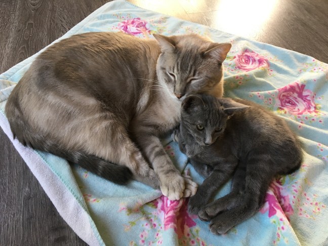 On the other hand, he bonded immediately with my big boy, Chucky. Even before I got the all clear to let him out of the kennel with the other animals, he and Chucky were nuzzling through the wires of the cage. Little boy recognized something in Chucky, recognized his own kind. And for the last two weeks, I have had the pleasure to watch them cuddle and play constantly.